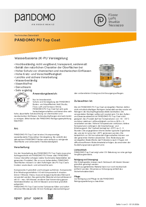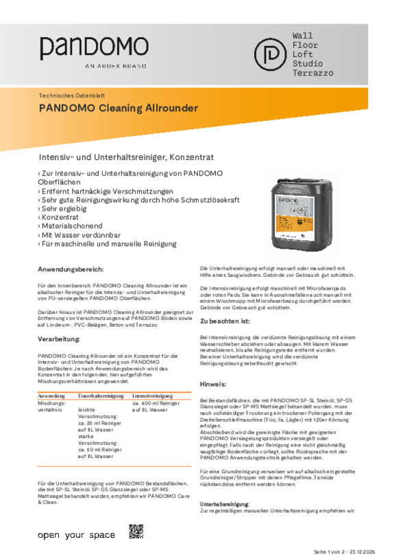 PANDOMO Oberflächen sind sehr widerstandsfähig und leicht zu reinigen. Eine Reinigung mit Neutralreinigern ist jederzeit möglich. Stehende Flüssigkeiten sollten sofort aufgenommen werden. PANDOMO bietet auch eigene Reinigungsprodukte an. Für detaillierte Informationen laden Sie unsere Reinigungsbroschüre herunter.