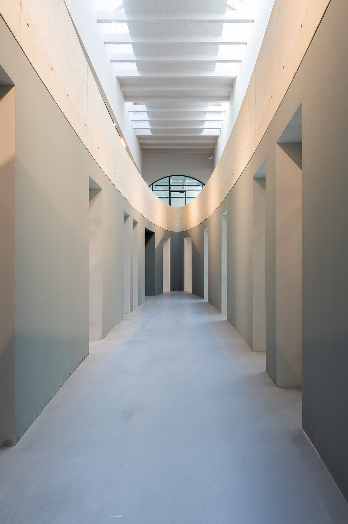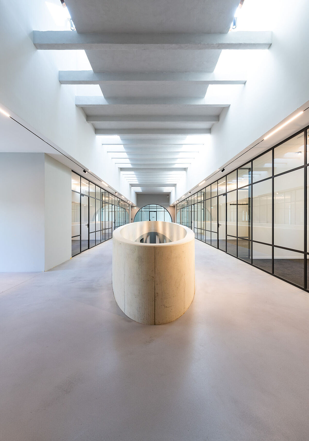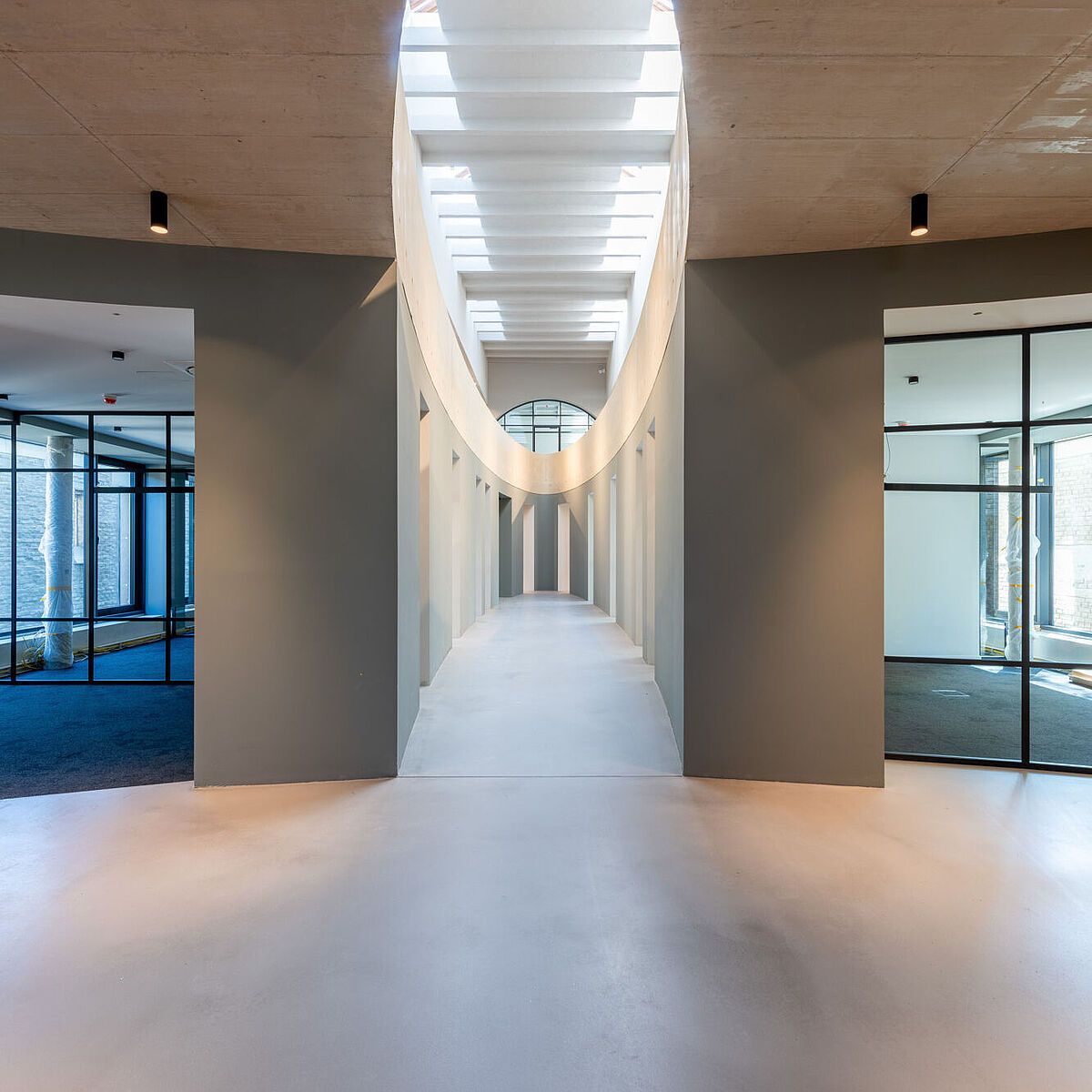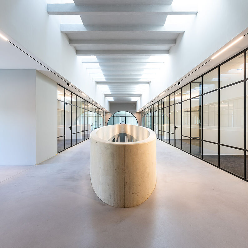 Im Inneren verbindet ein großzügiger ellipsenförmiger Luftraum Erd‑ und Obergeschoss. Es entstanden moderne Büroflächen im Kirchenraum sowie ergänzende Funktions‑ und Nebenräume im Erweiterungsbau. So wurde das äußere Erscheinungsbild der Kirche bewahrt und gleichzeitig ein zeitgemäßer Arbeitsort geschaffen.